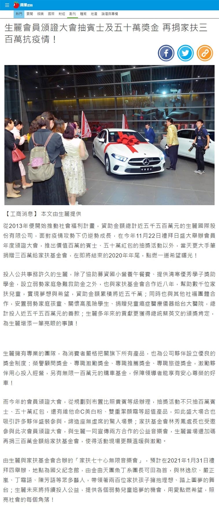 蘋果日報【生麗會員頒證大會抽賓士及五十萬獎金 再捐家扶三百萬抗疫情!】