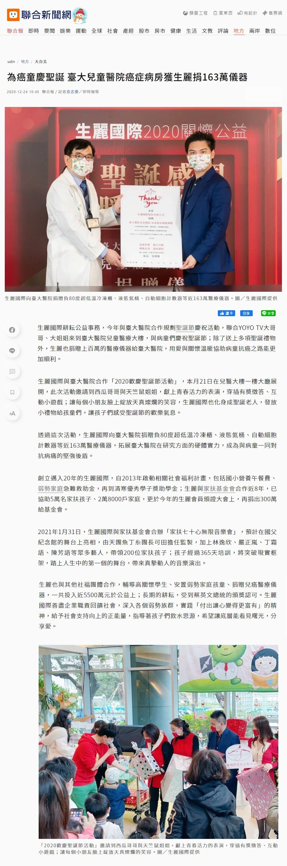 2020-12-24 聯合報 【為癌童慶聖誕 臺大兒童醫院癌症病房獲生麗捐163萬儀器】