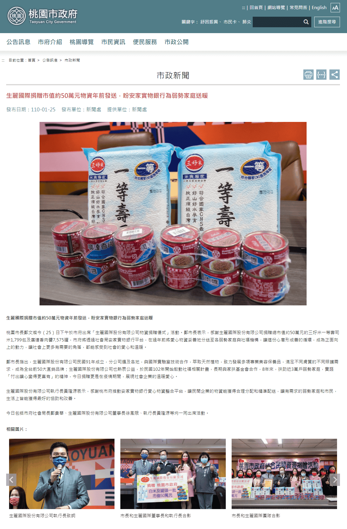 2021-1-25 桃園市政府新聞【生麗國際捐贈市值約50萬元物資年前發送 盼安家實物銀行為弱勢家庭送暖】