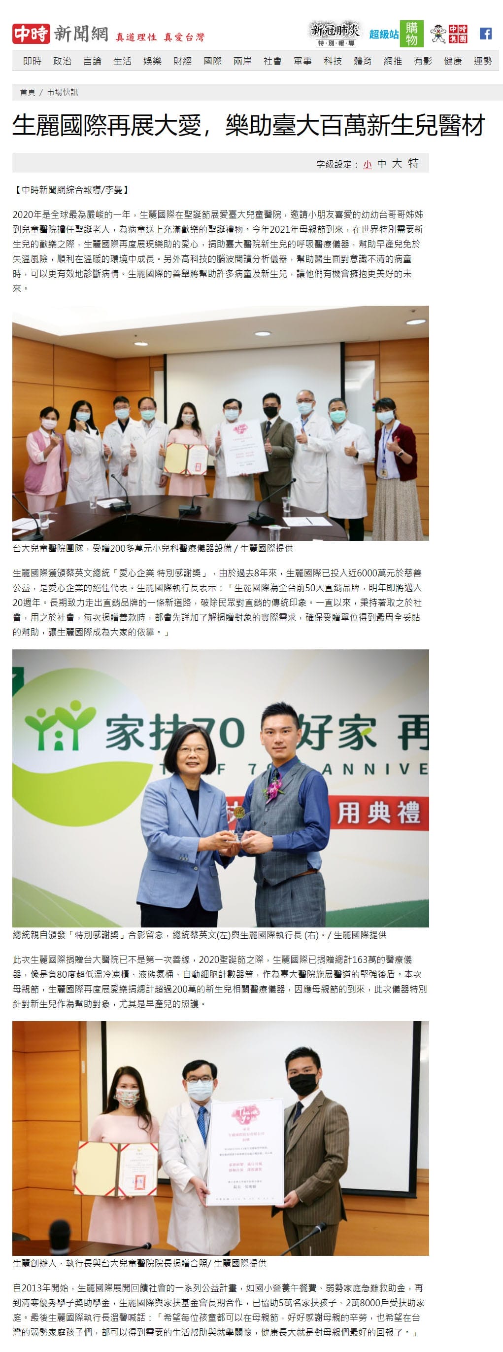 中國時報【生麗國際再展大愛 樂助臺大百萬新生兒醫材】 2021-5-7 中國時報 報導連結:act.chinatimes.com/market/content.aspx?AdID=9835&chdtv 分享到