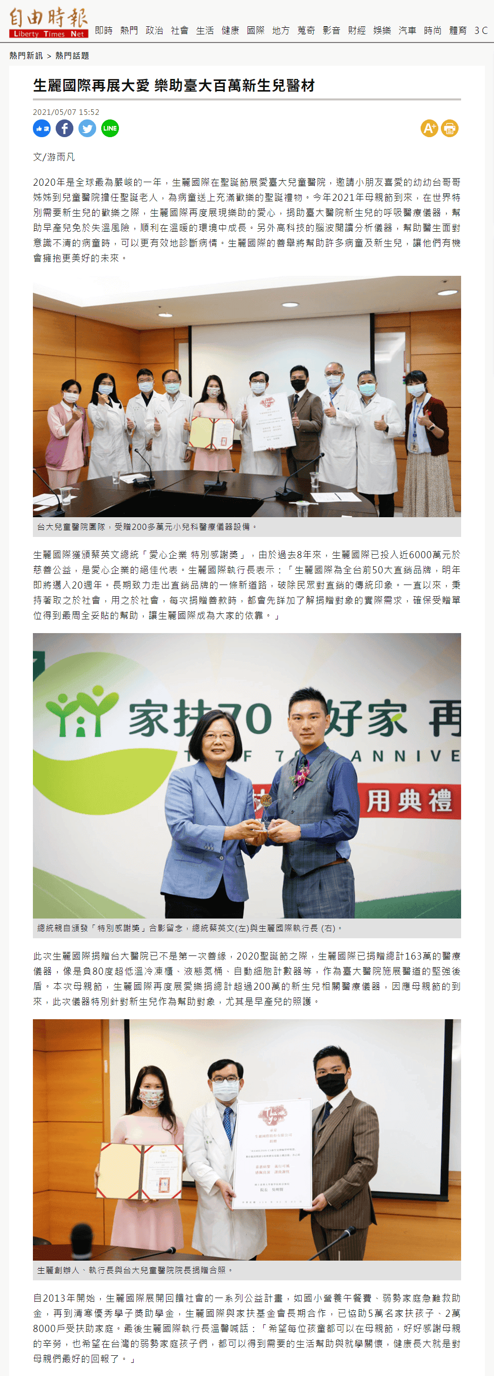 2021-5-7 自由時報【生麗國際再展大愛 樂助臺大百萬新生兒醫材】