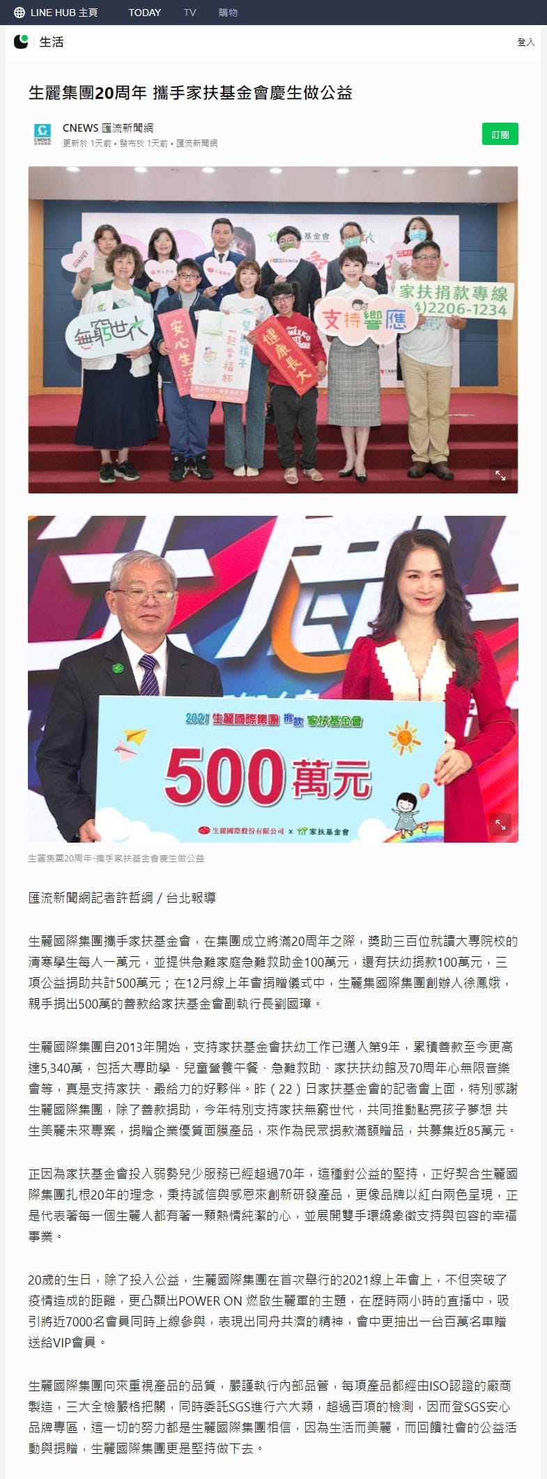 2021-12-23 LINE TODAY【生麗集團20周年 攜手家扶基金會慶生做公益】