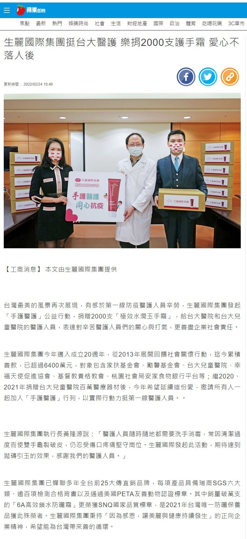 2022-2-24 蘋果日報【生麗國際集團挺台大醫護 樂捐2000支護手霜 愛心不落人後】