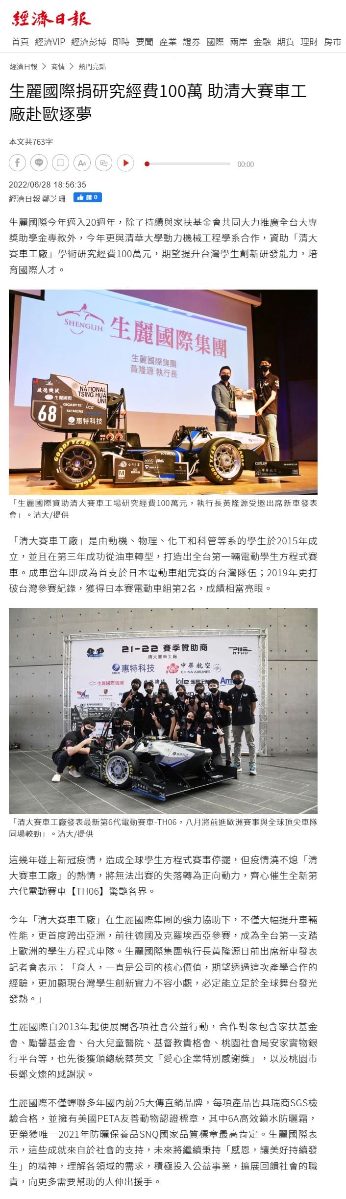 2022-6-28 經濟日報【生麗國際捐研究經費100萬 助清大賽車工廠赴歐逐夢】