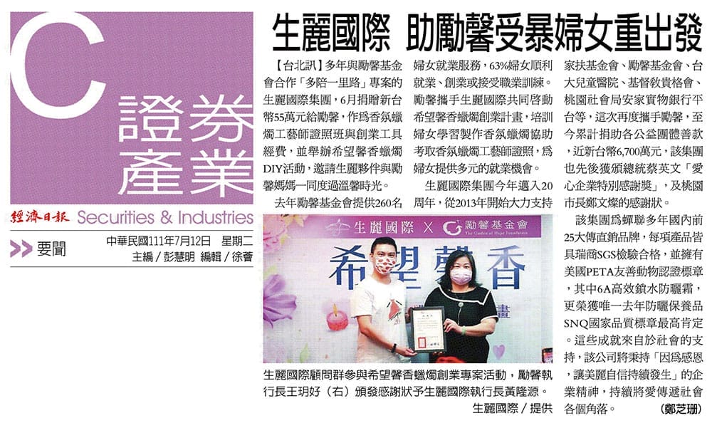 2022-7-12 經濟日報【生麗國際 助勵馨受暴婦女重出發】