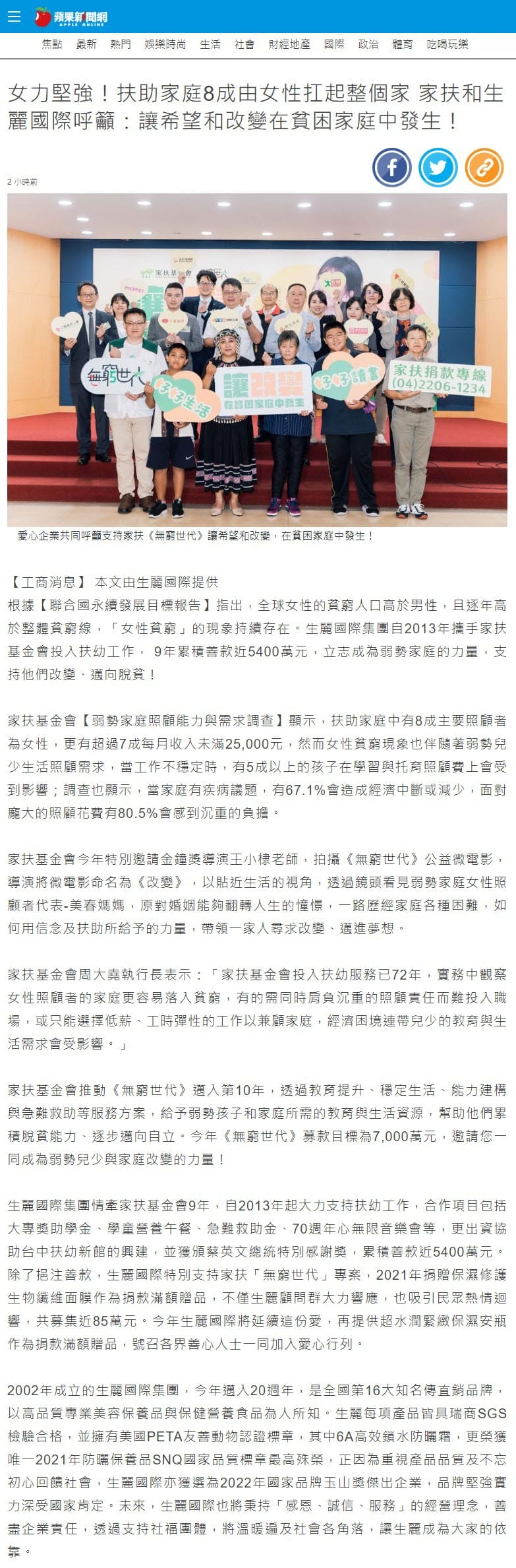 2022-7-22 蘋果日報【女力堅強!扶助家庭8成由女性扛起整個家 家扶和生麗國際呼籲:讓希望和改變在貧困家庭中發生!】