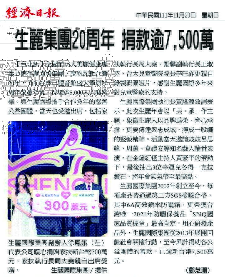 2022-11-20 經濟日報【生麗集團20周年 捐款逾7500萬】