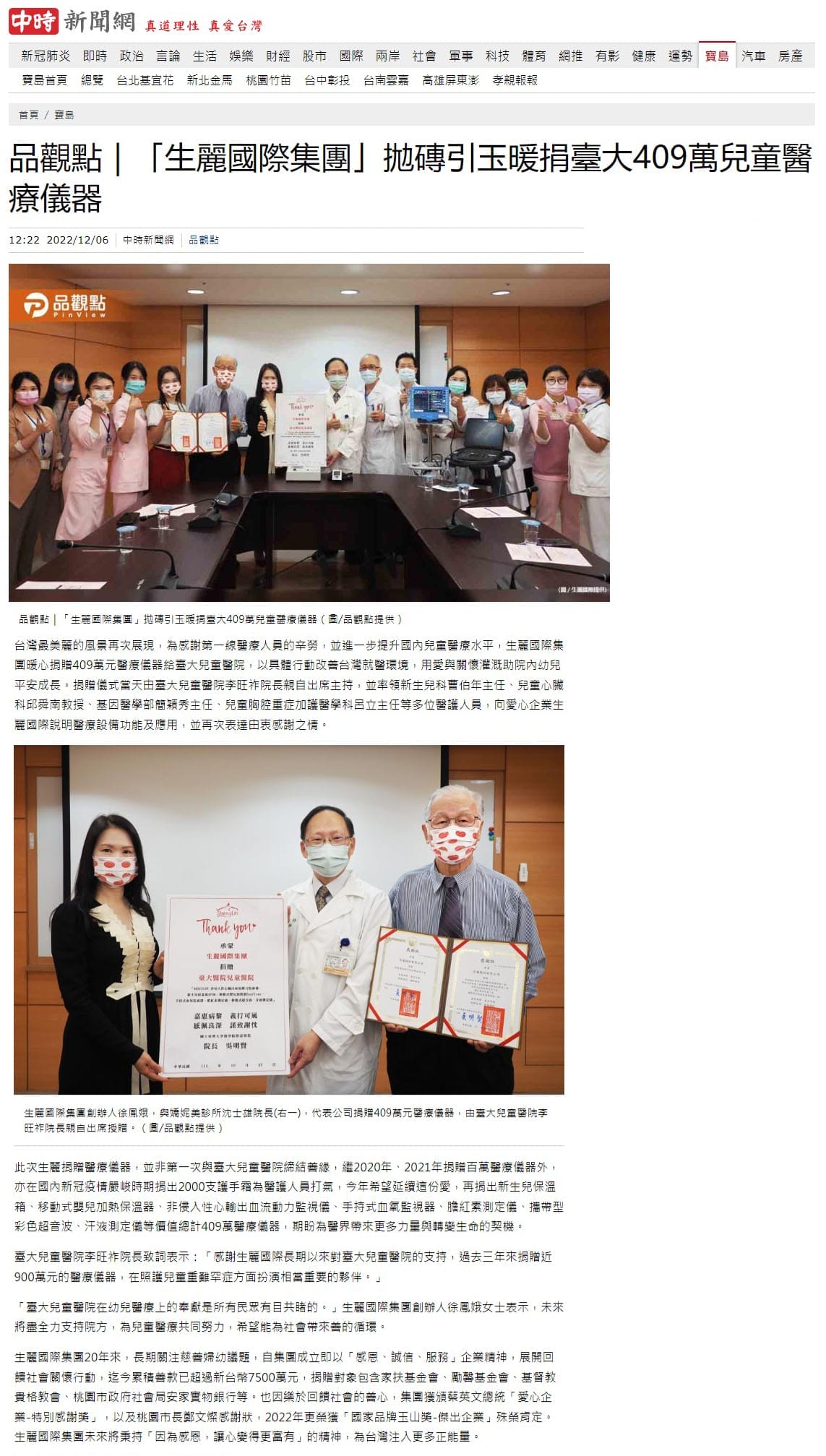 2022-12-6 中國時報【生麗國際集團拋磚引玉 暖捐臺大409萬兒童醫療儀器】