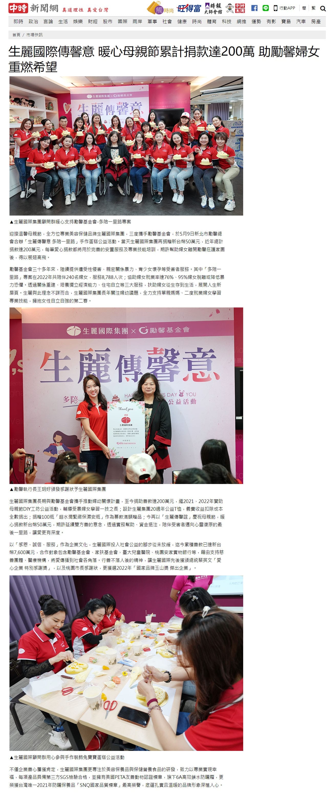 2023-5-10 中時新聞【生麗國際傳馨意 暖心母親節累計捐款達200萬 助勵馨婦女重燃希望】