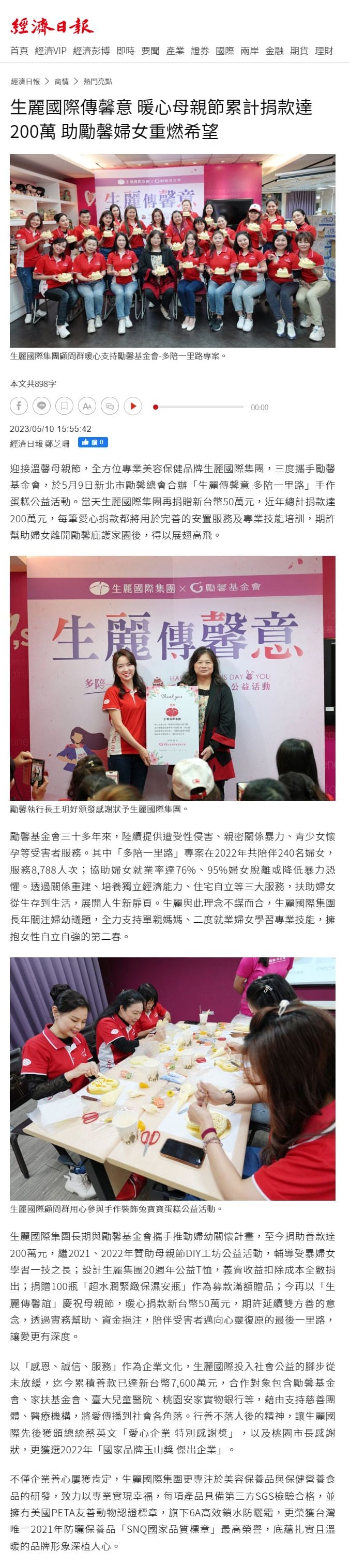 2023-5-10 經濟日報【生麗國際傳馨意 暖心母親節累計捐款達200萬 助勵馨婦女重燃希望】