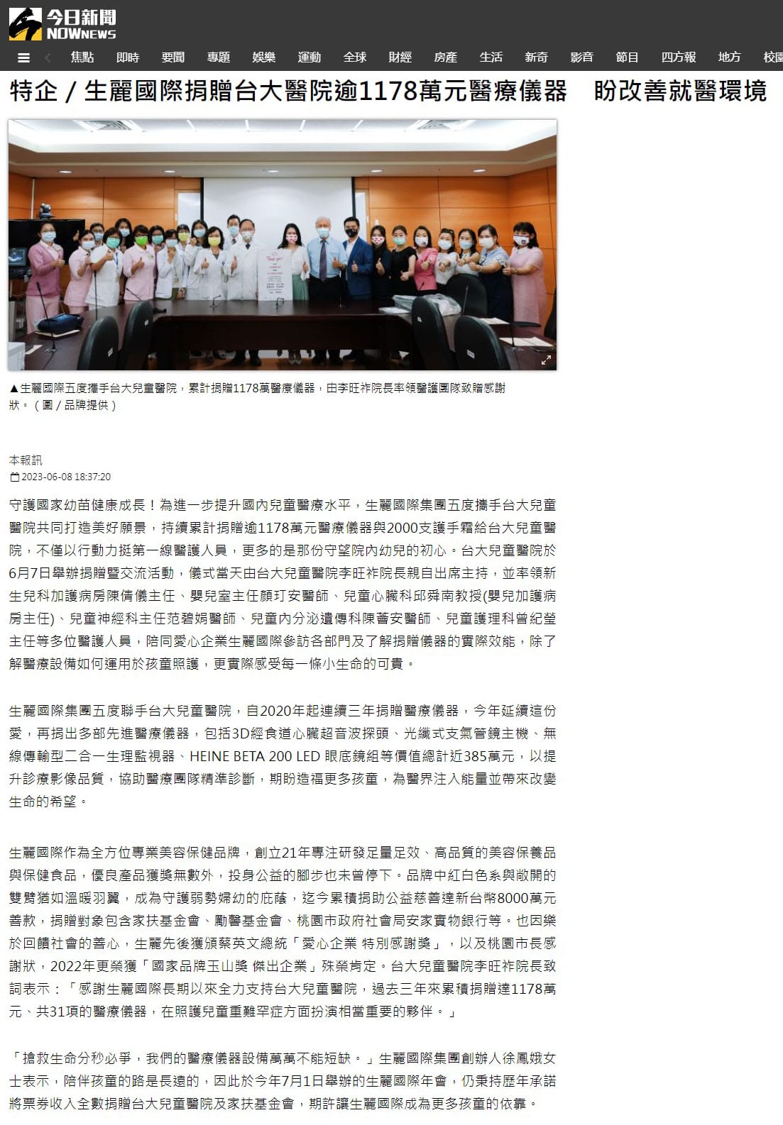 2023-6-8 NOWnews【生麗國際捐贈台大醫院逾1178萬元醫療儀器 盼改善就醫環境】