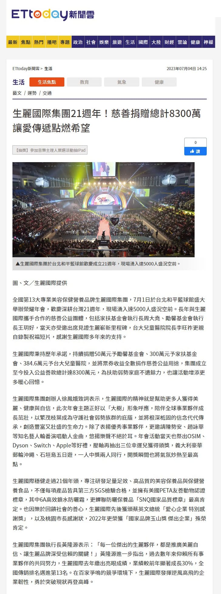 2023-7-4 ETtoday【生麗國際集團21週年!慈善捐贈總計8300萬 讓愛傳遞點燃希望】