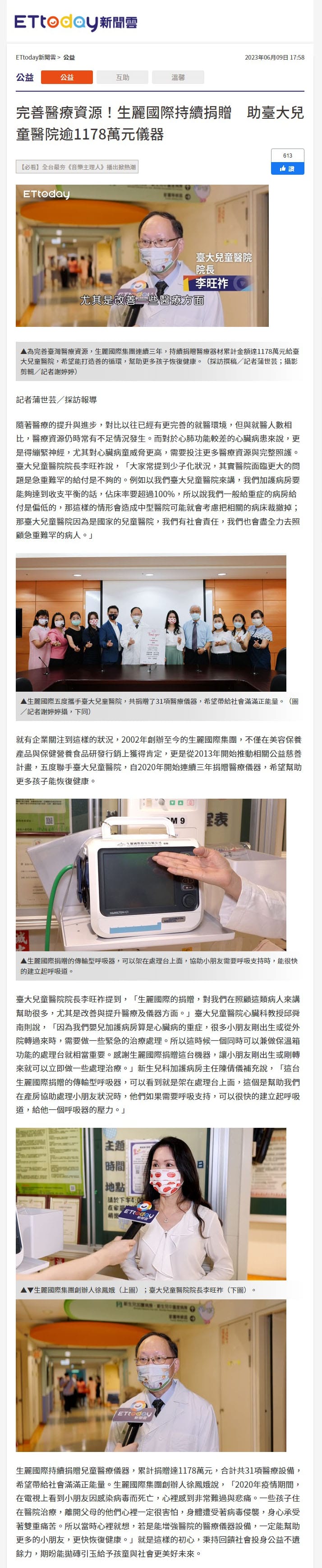 2023-6-9 ETtoday【完善醫療資源!生麗國際持續捐贈 助臺大兒童醫院逾1178萬元儀器】