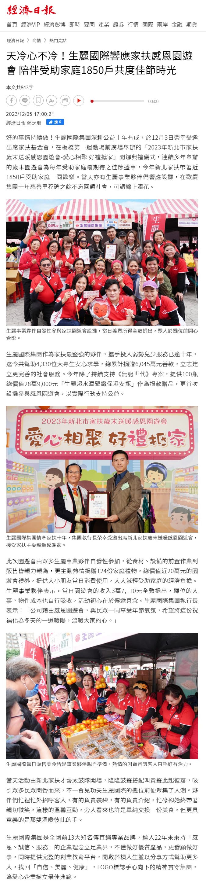 2023-12-5 經濟日報【天冷心不冷!生麗國際響應家扶感恩園遊會 陪伴受助家庭1850戶共度佳節時光】