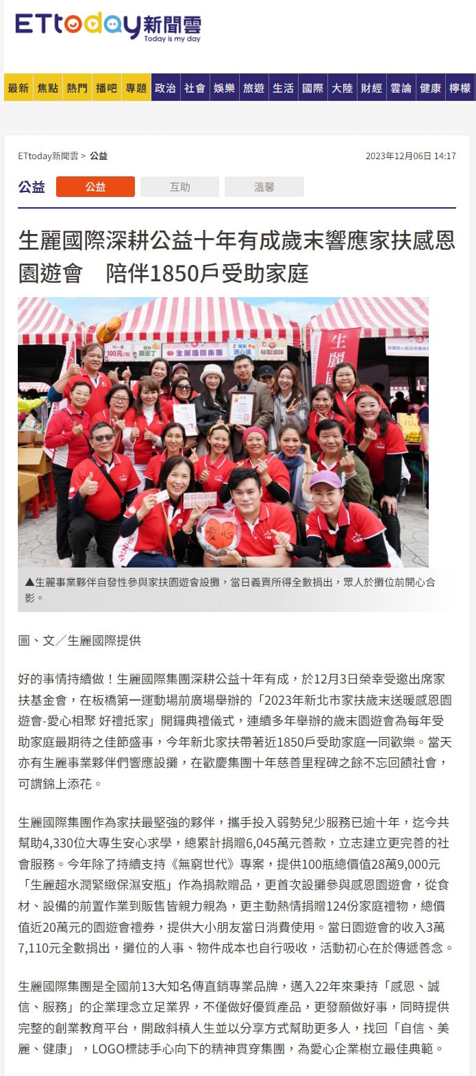 2023-12-6 ETtoday【生麗國際深耕公益十年有成 歲末響應家扶感恩園遊會 陪伴1850戶受助家庭】