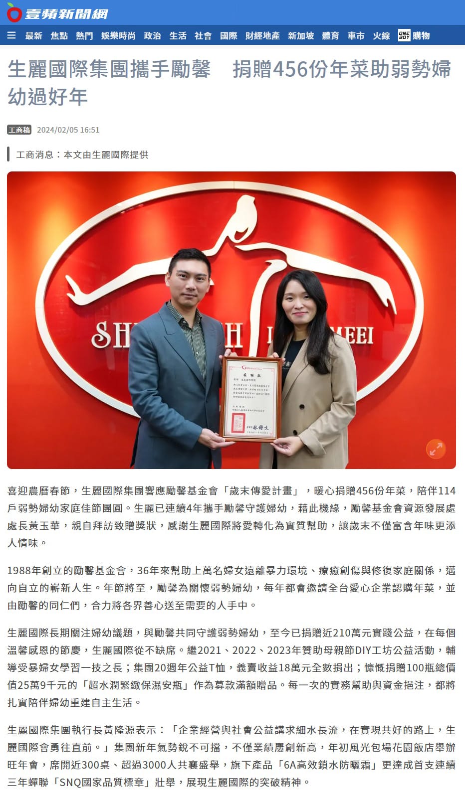 2024-2-6 壹蘋新聞【生麗國際集團攜手勵馨 捐贈456份年菜助弱勢婦幼過好年】
