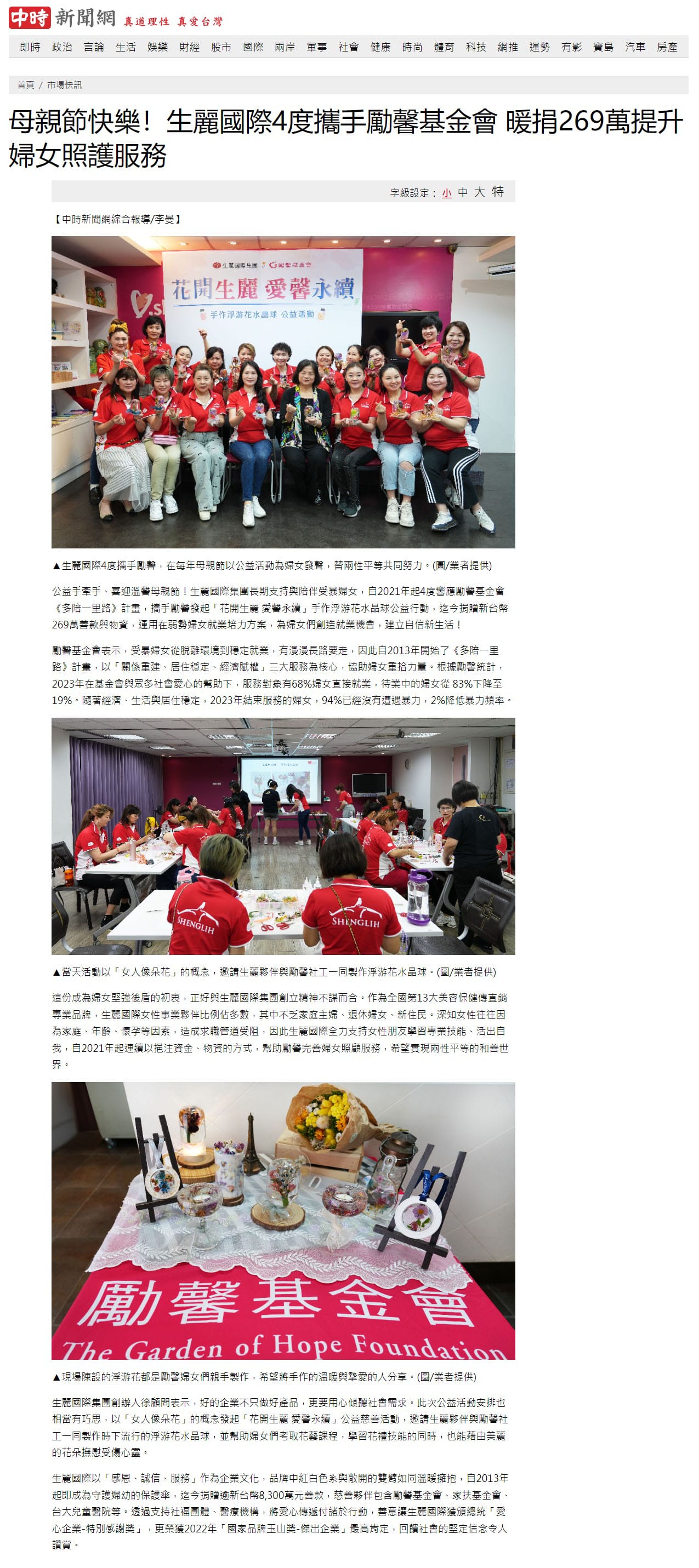 2024-5-9 中時新聞【母親節快樂!生麗國際4度攜手勵馨基金會 暖捐269萬提升婦女照護服務】