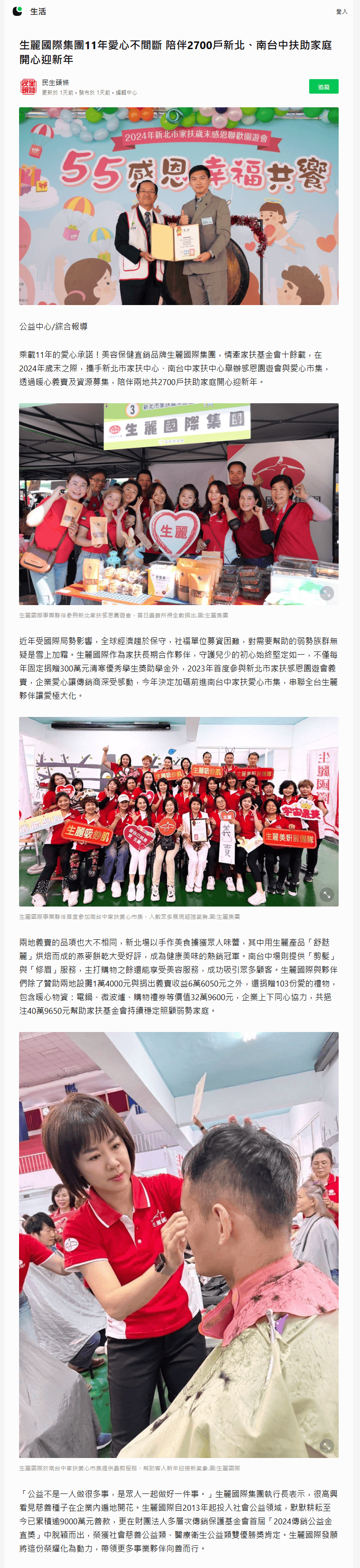 2024-12-23 LINE TODAY【生麗國際集團11年愛心不間斷 陪伴2700戶新北、南台中扶助家庭開心迎新年】