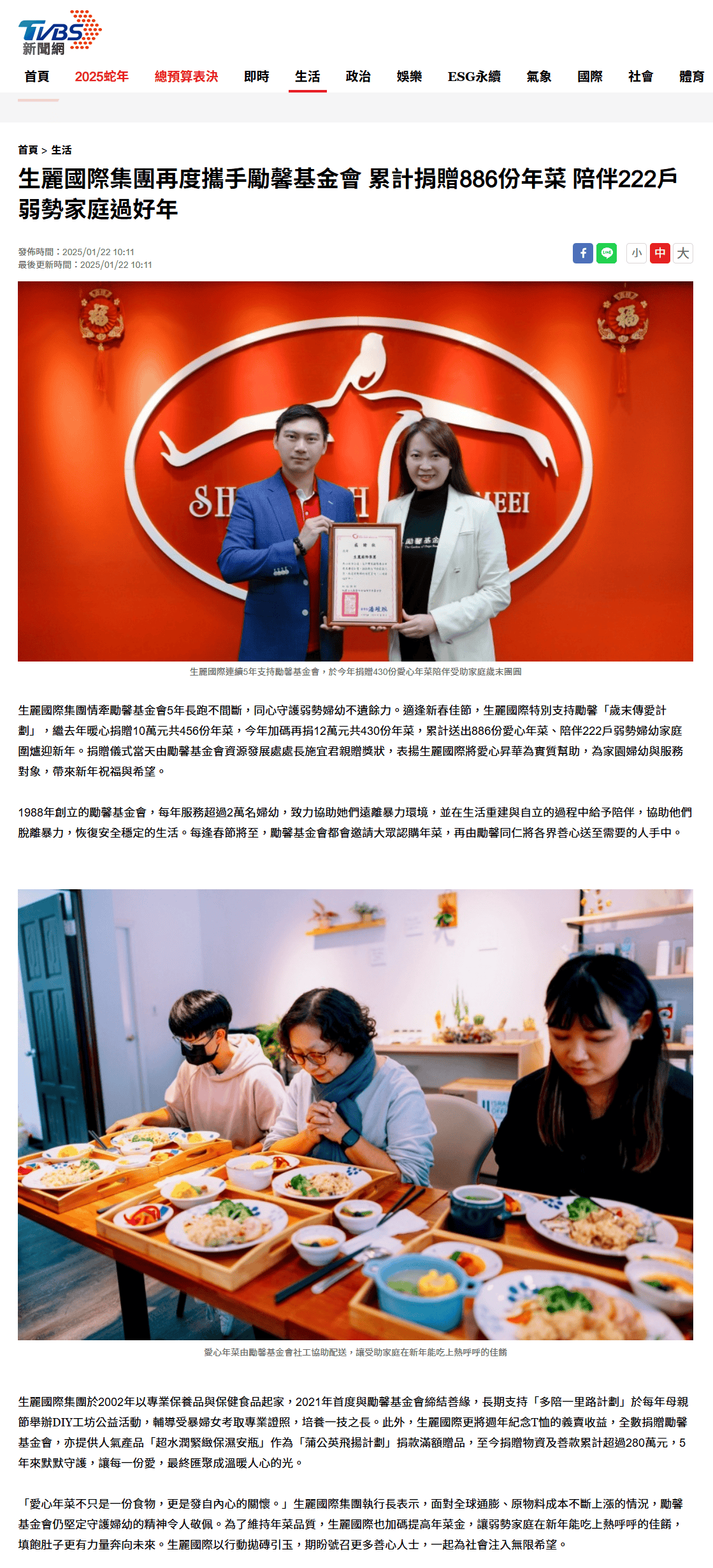 2025-1-22 TVBS【生麗國際集團再度攜手勵馨基金會 累計捐贈886份年菜 陪伴222戶弱勢家庭過好年】