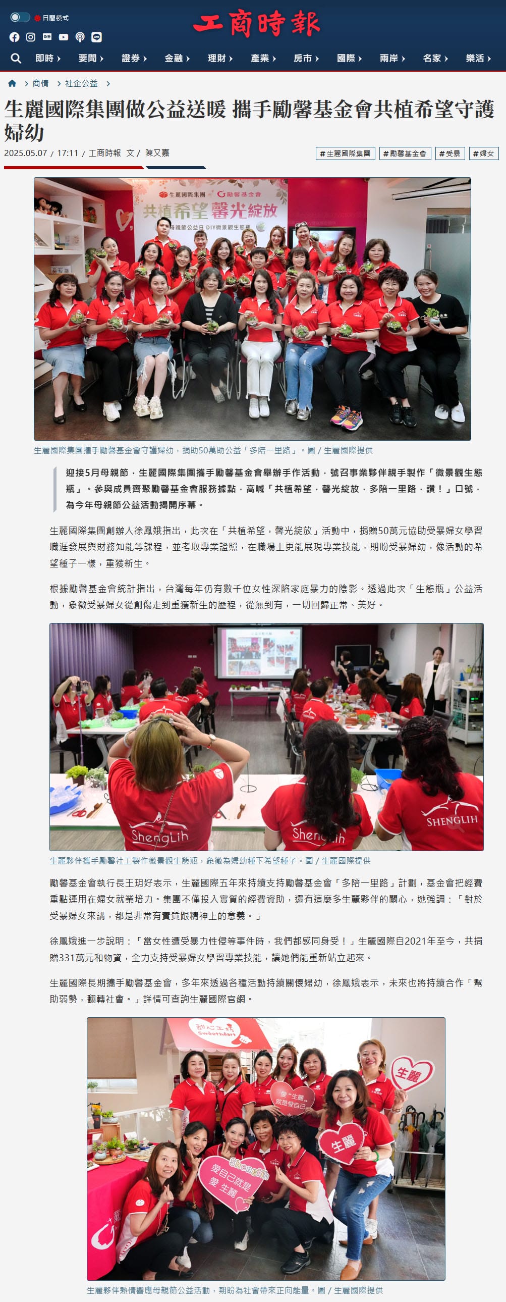 2025-5-7 工商時報【生麗國際集團做公益送暖 攜手勵馨基金會共植希望守護婦幼】