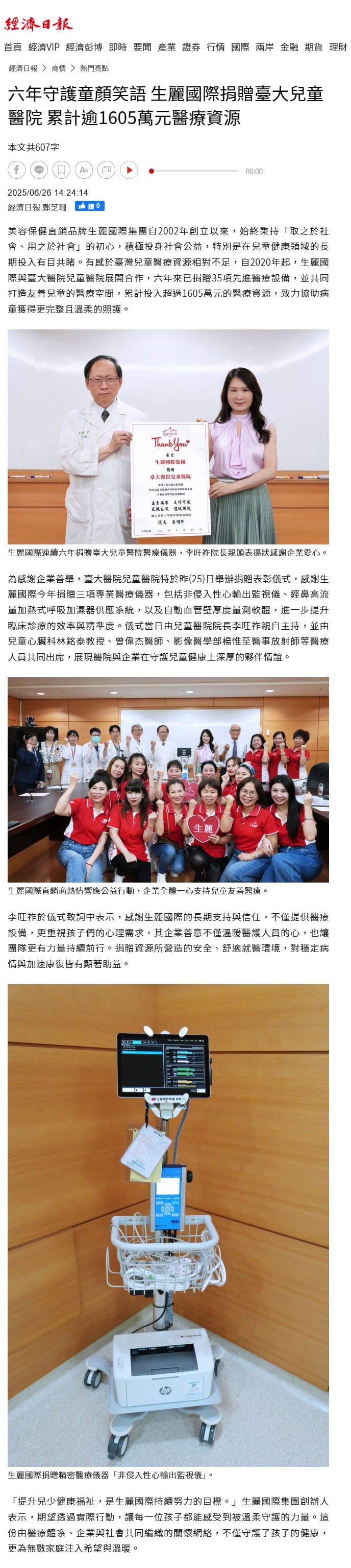 2025-06-26 經濟日報【六年守護童顏笑語 生麗國際捐贈臺大兒童醫院 累計逾1605萬元醫療資源】