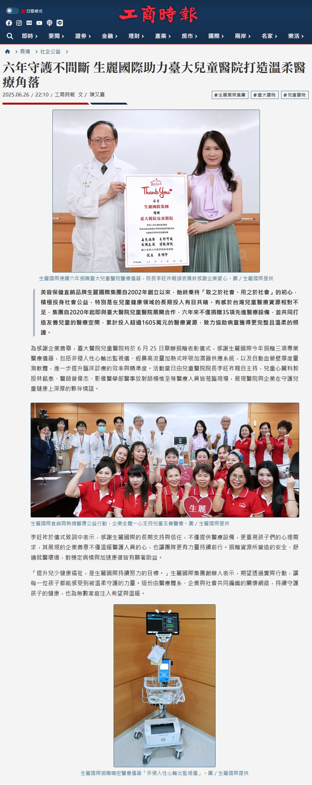 2025-6-26 工商時報【六年守護不間斷 生麗國際助力臺大兒童醫院打造溫柔醫療角落】