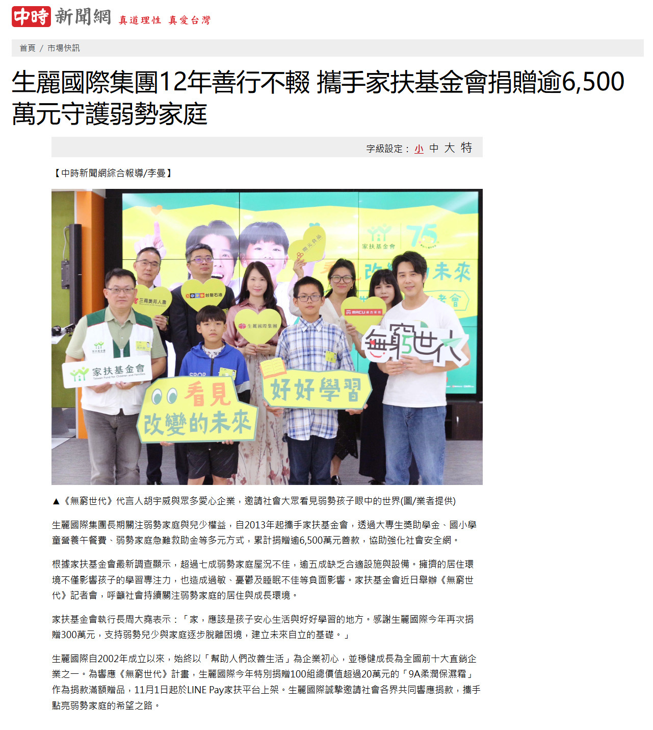 2025-8-27 中時新聞【生麗國際集團12年善行不輟 攜手家扶基金會捐贈逾6,500萬元守護弱勢家庭】