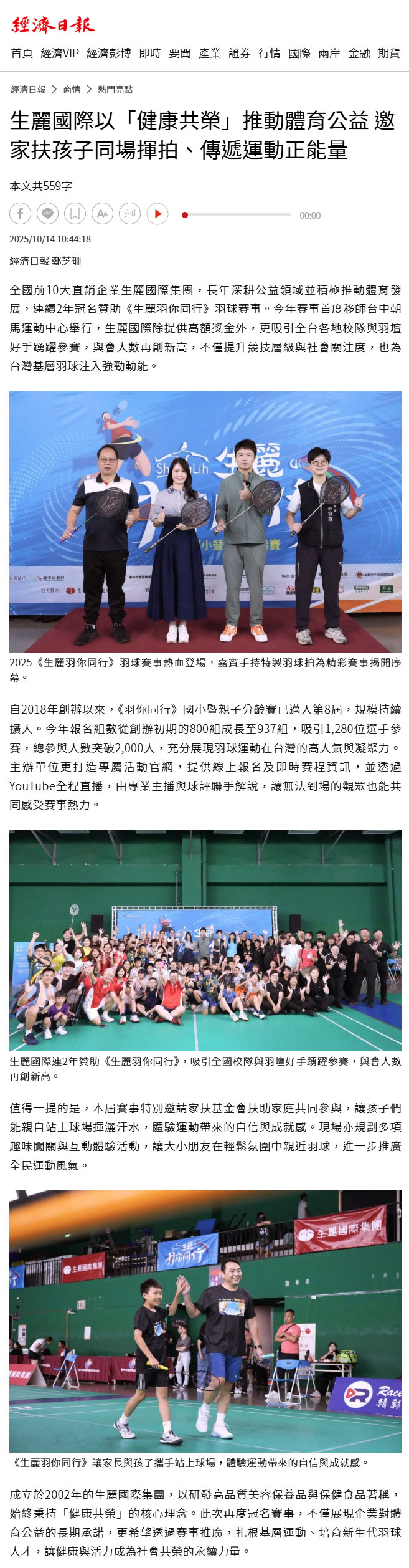 2025-10-14 經濟日報【生麗國際以「健康共榮」推動體育公益 邀家扶孩子同場揮拍、傳遞運動正能量】