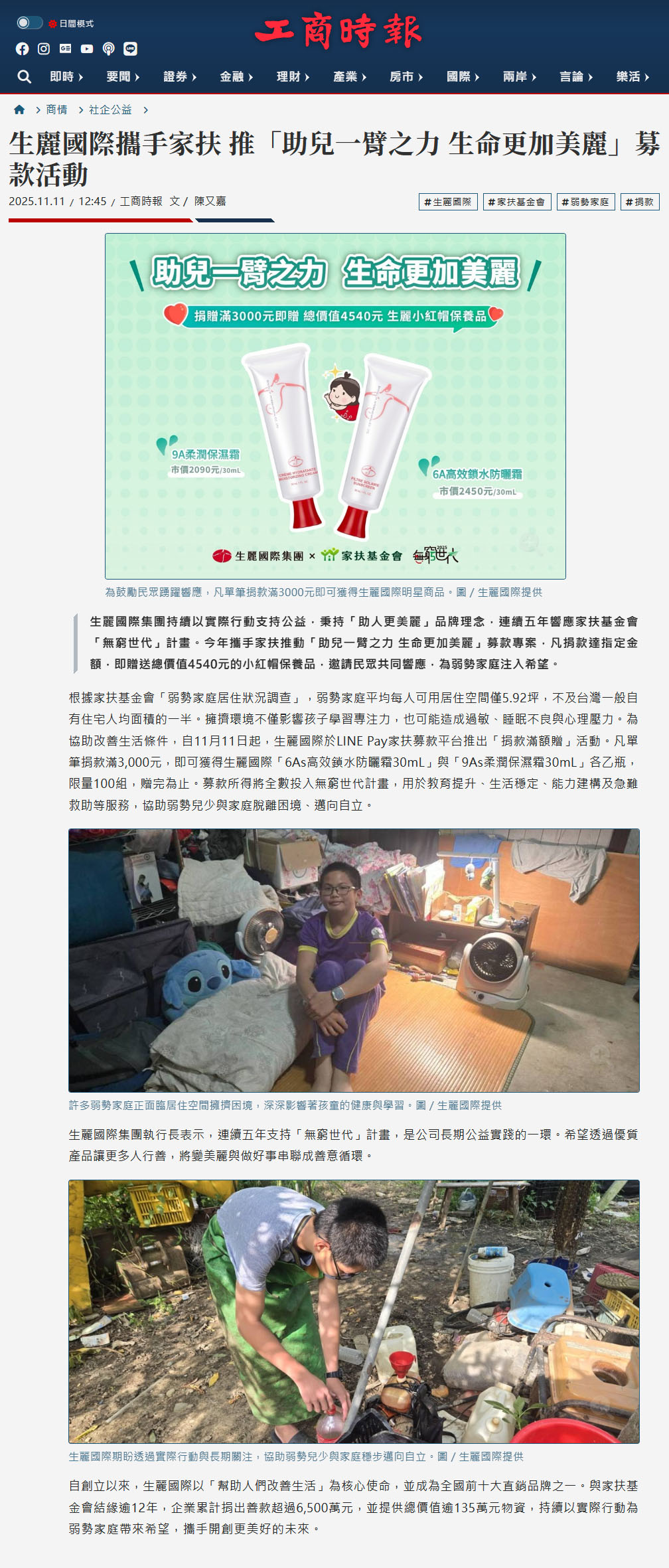 2025-11-11 工商時報【生麗國際攜手家扶 推「助兒一臂之力 生命更加美麗」募款活動】