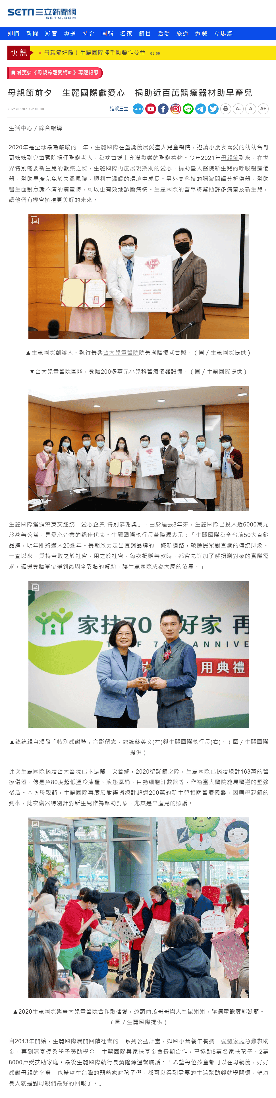 2021-5-7 三立新聞【生麗國際獻愛心 捐助近百萬醫療器材助早產兒】