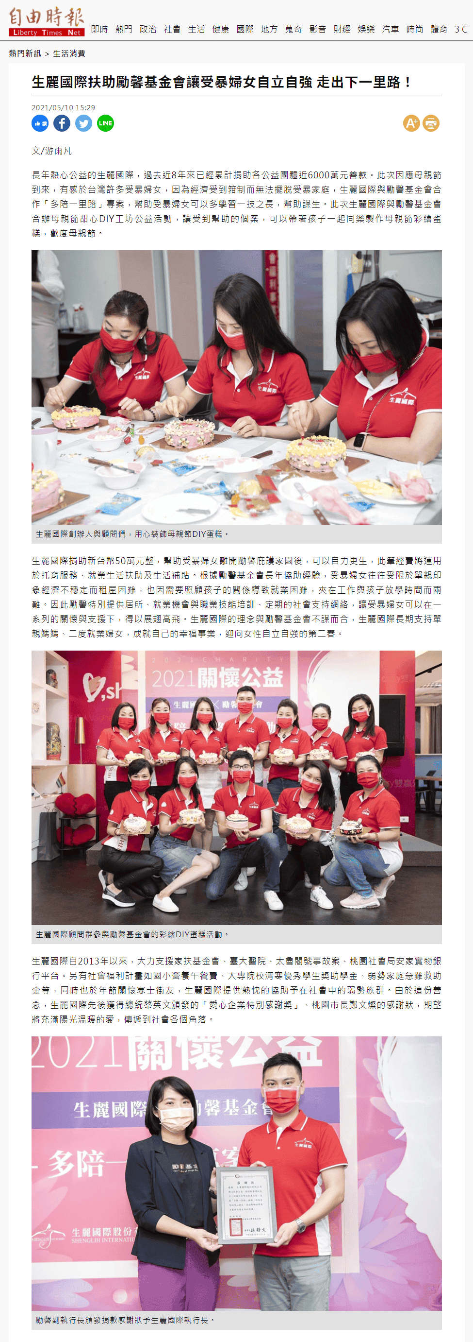 2021-5-10 自由時報【生麗國際扶助勵馨基金會讓受暴婦女自立自強 走出下一里路】