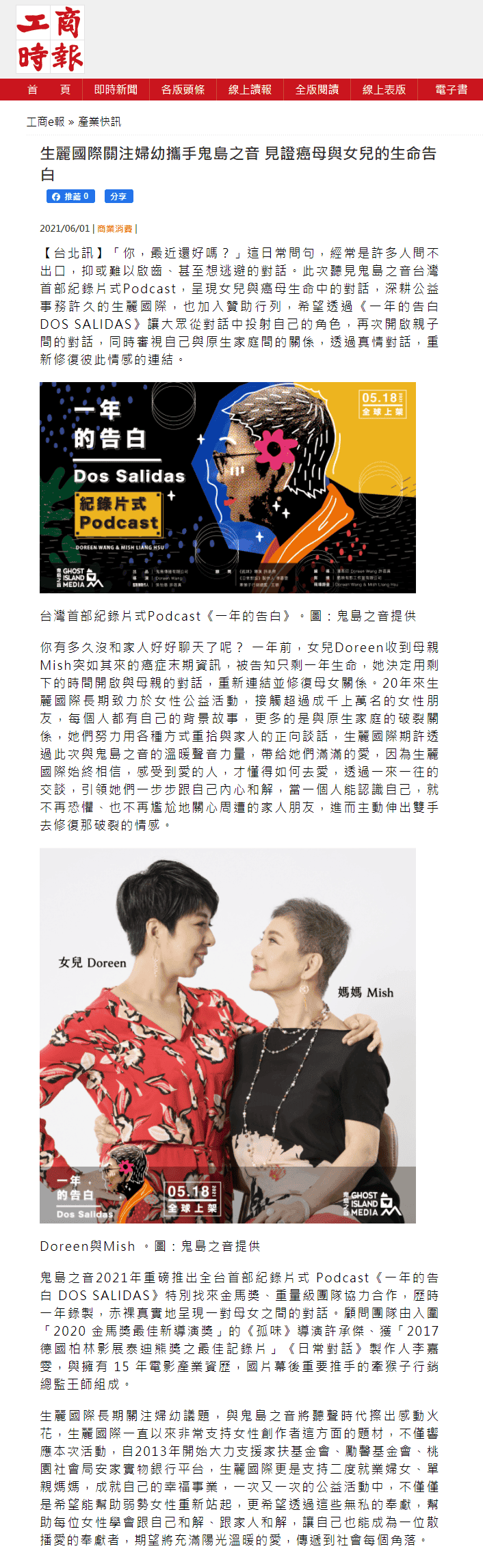 2021-6-1 工商時報【生麗國際關注婦幼攜手鬼島之音 見證癌母與女兒的生命告白】