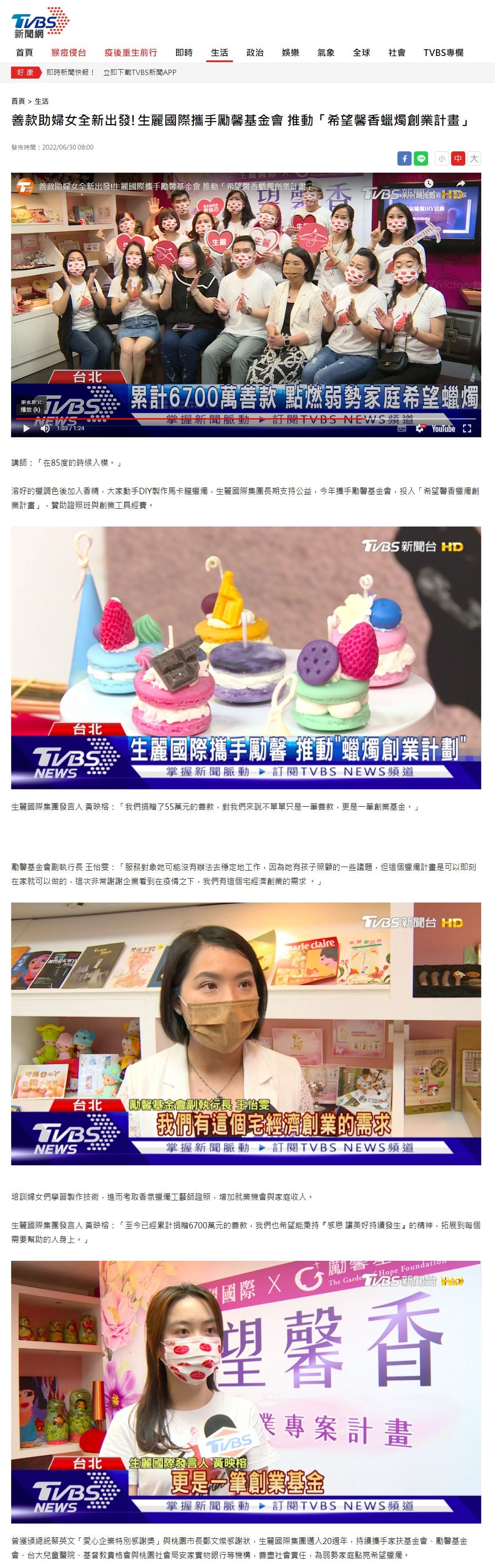 2022-6-30 TVBS新聞【善款助婦女全新出發!生麗國際攜手勵馨基金會 推動「希望馨香蠟燭創業計畫」】