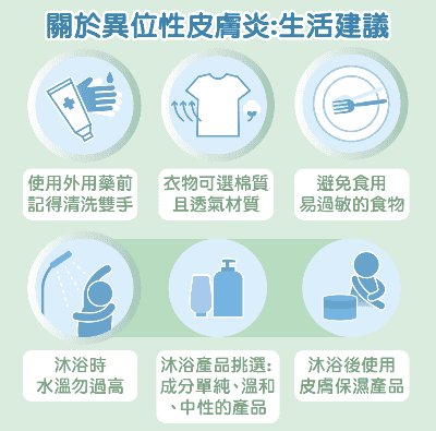 除了用藥來緩解不適,日常生活中也有許多方法能舒緩,例如:穿棉質且透氣的衣服;沐浴水溫勿過高;選用成分單純、溫和的中性皂或沐浴乳;沐浴後塗抹保濕乳液,維持濕潤;避免易過敏的食物。若皮膚已出現發紅腫現象,應儘速接受皮膚科醫師的處方治療就醫。