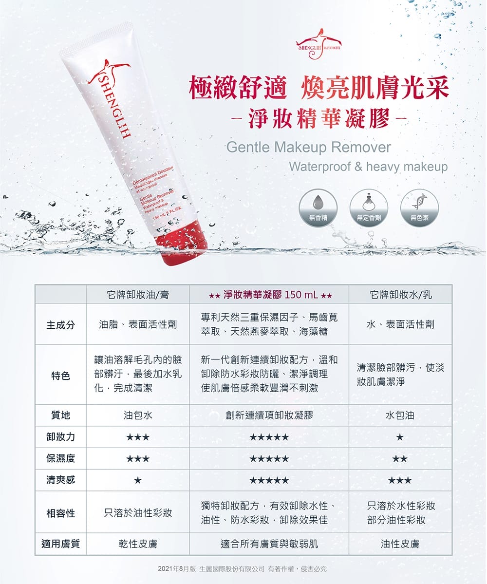含有ECOCERT認證專利天然三重保濕因子、馬齒莧精萃、天然燕麥精萃、天然海藻糖,等多機能保濕舒緩活性成分和特殊的水感凝膠劑型,完美地將防水彩妝、防曬隔離霜卸除得一乾二淨,優秀的創新連續卸妝配方、不含礦物油等成分,適合所有膚質與敏弱肌,使用後讓肌膚重現柔嫩潔淨臉龐,彷彿沐浴在舒適幸福的保養體驗中